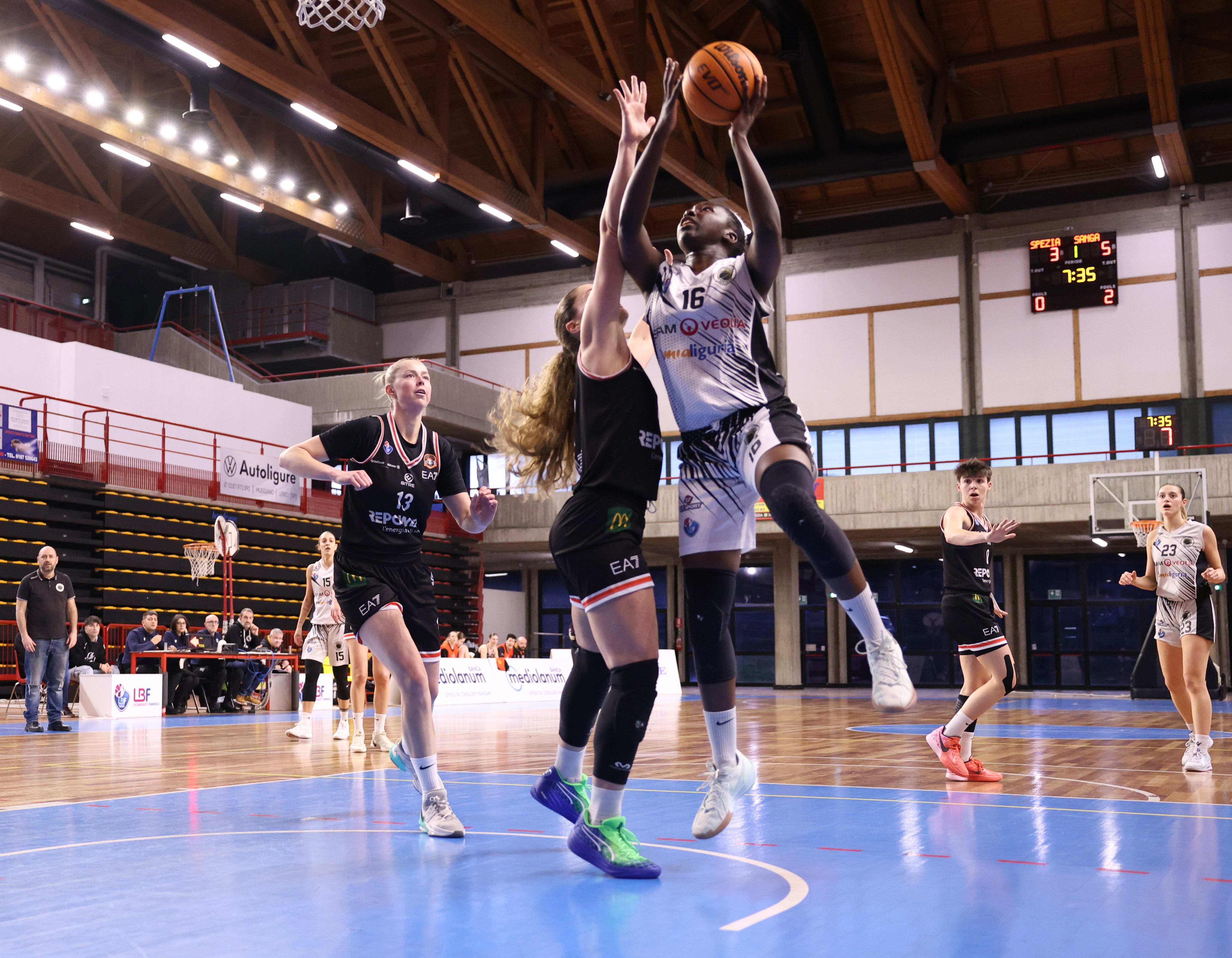 Il match si apre con uno 0-5 meneghino tutto firmato da Toffali. La Cestistica però risponde con un gioco da tre punti di Diakhoumpa che tiene a contatto le bianconere. Le padrone di casa provano a seguire il passo della RePower, sempre avanti e in progressione, senza però riuscire a ridurre il distacco ad un singolo possesso. La maggiore fisicità sotto canestro e l’esplosività di Toffali sono le due chiavi che permettono al Sanga di scardinare la difesa spezzina, mentre la Cestistica in attacco fatica a trovare ritmo e continuità nonostante qualche canestro. Dopo i primi dieci minuti le ospiti sono avanti 14-22. Nel secondo periodo Milano trova anche il +16 (18-34) ma, quando la strada sembra spianata, ecco arrivare la reazione bianconera col trio Missanelli-Guerrieri-Moretti, che porta a dimezzare lo svantaggio (28-36). Il momento favorevole prosegue però solo a livello difensivo nei successivi due minuti, in cui le giocatrici di coach Corsolini sono brave ad impedire al Sanga di trovare il canestro, anche se si fanno sfuggire una manciata di opportunità per avvicinarsi ulteriormente. Gli ultimi novanta secondi della seconda frazione sono funesti per la Cestistica, in cui la RePower piazza il break di 0-9 che spezza ogni velleità di rimonta. All’intervallo lungo si va sul 28-45. Nella ripresa la compagine spezzina alza definitivamente bandiera bianca, con Milano che trova anche il +26 (34-60), sfruttando la scarsa vena realizzativa delle padrone di casa. L’ultimo quarto è ininfluente ai fini dell’esito della gara, il Sanga rallenta i ritmi ma la Cestistica non ne approfitta per rendere il passivo meno pesante. Al PalaMariotti finisce 49-74 per le ospiti.